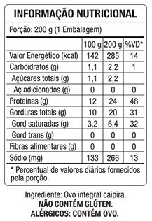 Omelete com Ovo Integral obtido de ovo fresco de galinhas caipiras criadas livres , após remoção da casca, filtrado, pasteurizado e resfriado. Líquido homogêneo de coloração amarela característica.